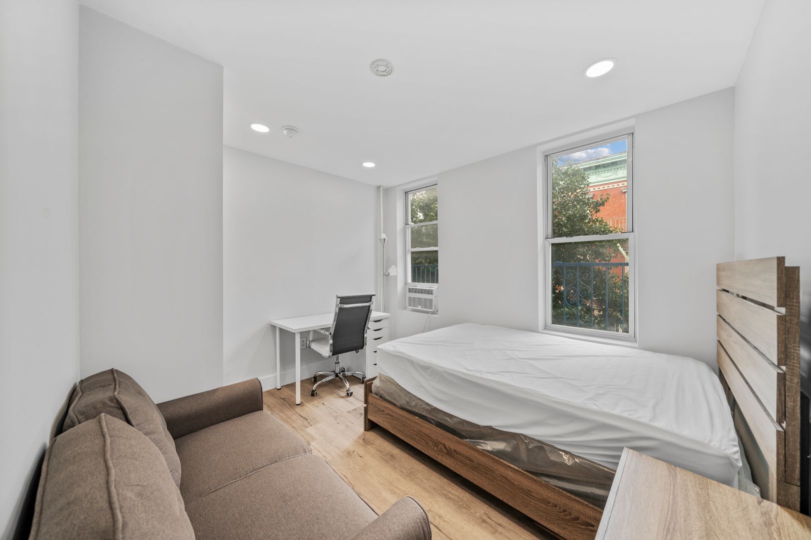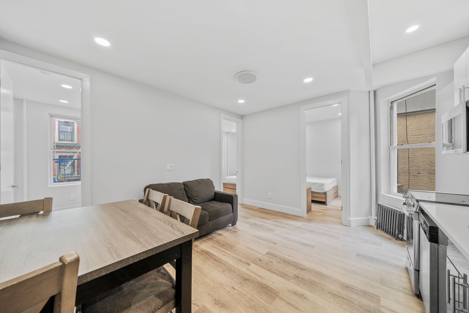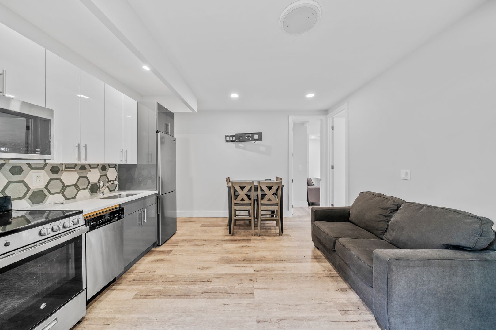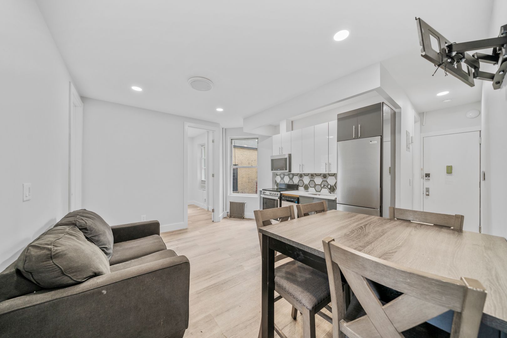 This true 4 bedroom 1 bath has been fully gut renovated and boasts queen sized bedrooms, large living room area, beautiful modern finishes including brand new hardwood floors, recessed lighting, sleek kitchen design with granite countertops and LG and GE stainless steel appliances, brand new modernized bathroom with rain shower and more. The units come fully furnished with full sized beds, couches, tables, free smart TV, all utilities included, and more!